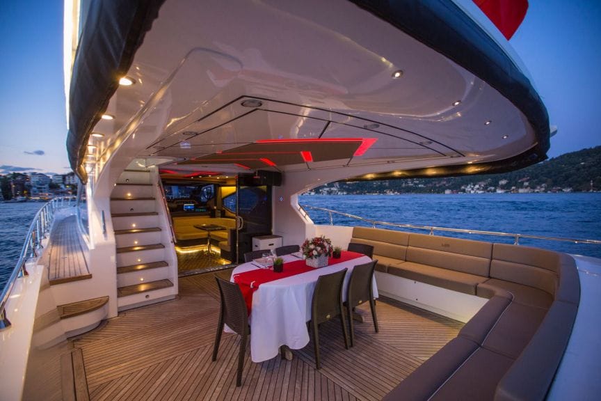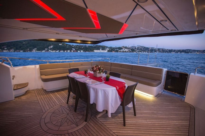 Kurumsal ilişkileri pekiştirmek ve iş ortaklarınıza ayrıcalıklı bir deneyim yaşatmak için İstanbul Boğazı'nda özel bir yemek organizasyonu bu lüks yatla hayata geçirilebilir. Sessiz motorlu tahrik sistemi, geniş oturma güvertesi ve kişiye özel ikram menüsüyle misafirlerinize unutulmaz bir Boğaz keyfini sunun.